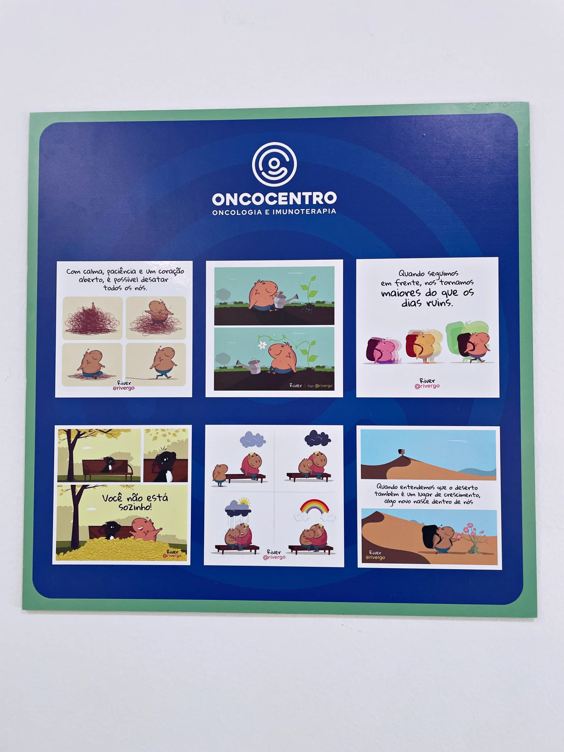 Na Oncocentro, temos uma parceria especial com o River, pois acreditamos que suas mensagens combinam perfeitamente com o ambiente da clínica e ajudam a levar ânimo e acolhimento aos pacientes. Já realizamos diversas ações juntos, como: